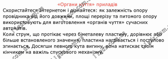 «Органи чуття» приладів Скористайтеся Інтернетом і дізнайтеся: як залежність опору провідника від його довжини, площі перерізу та питомого опору використовують для виготовлення «органів чуття» сучасних автоматів. Коли струм, що протікає через біметалеву пластину, дорівнює або більше встановленого значення, пластина нагрівається і поступово згинається. Досягши певного кута вигину, вона натискає своїм кінчиком на важіль спускового механізму.