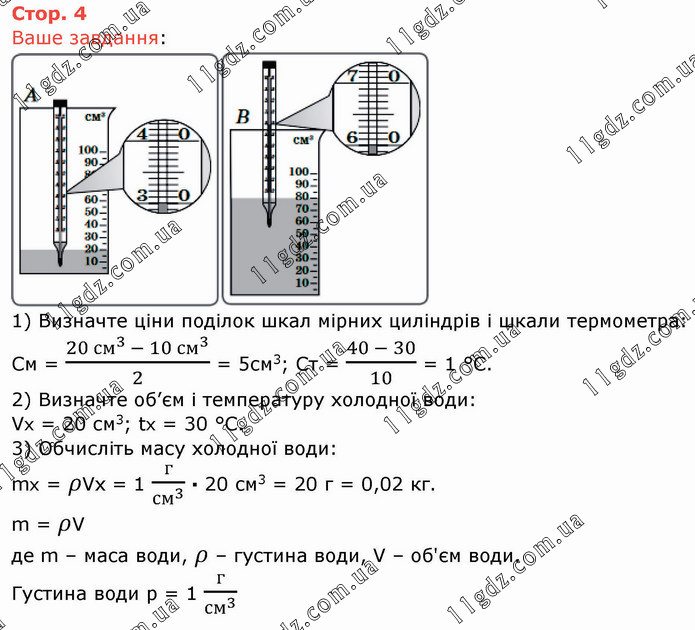 1) Визначте ціни поділок шкал мірних циліндрів і шкали термометра: См = (20 〖см〗^(3 )- 10 〖см〗^3)/2 = 5см3; Ст = (40 - 30)/10 = 1 °С. 2) Визначте об’єм і температуру холодної води: Vx = 20 см3; tx = 30 °C. 3) Обчисліть масу холодної води: mx = ρVx = 1 г/〖см〗^3 ∙ 20 см3 = 20 г = 0,02 кг. m = ρV де m – маса води, ρ – густина води, V – об'єм води. Густина води р = 1 г/〖см〗^3