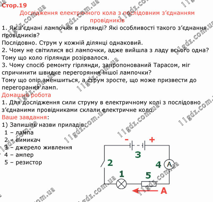 Дослідження електричного кола з послідовним з’єднанням провідників 1. Як з’єднані лампочки в гірлянді? Які особливості такого з’єднання провідників? Послідовно. Струм у кожній ділянці однаковий. 2. Чому не світилися всі лампочки, адже вийшла з ладу всього одна? Тому що коло гірлянди розірвалося. 3. Чому спосіб ремонту гірлянди, запропонований Тарасом, міг спричинити швидке перегоряння іншої лампочки? Тому що опір зменшиться, а струм зросте, що може призвести до перегорання ламп. Домашня робота 1. Для дослідження сили струму в електричному колі з послідовно з’єднаними провідниками склали електричне коло. Ваше завдання: 1) Запишіть назви приладів. 1 – лампа 2 – вимикач 3 – джерело живлення 4 – ампер 5 – резистор