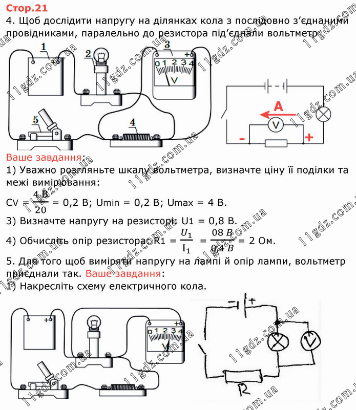4. Щоб дослідити напругу на ділянках кола з послідовно з’єднаними провідниками, паралельно до резистора під’єднали вольтметр Ваше завдання: 1) Уважно розгляньте шкалу вольтметра, визначте ціну її поділки та межі вимірювання: CV = (4 B)/20 = 0,2 B; Umin = 0,2 B; Umax = 4 B. 3) Визначте напругу на резисторі: U1 = 0,8 B. 4) Обчисліть опір резистора: R1 = U_1/I_1 = (08 B)/(0,4 B) = 2 Ом. 5. Для того щоб виміряти напругу на лампі й опір лампи, вольтметр приєднали так. Ваше завдання: 1) Накресліть схему електричного кола.