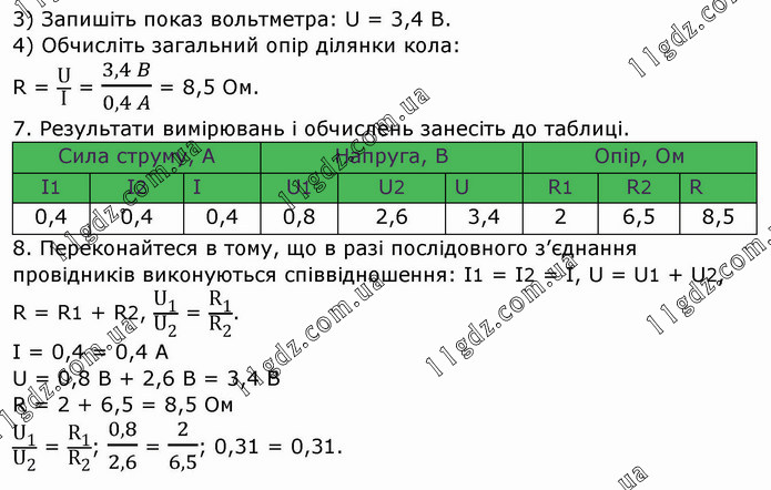 3) Запишіть показ вольтметра: U = 3,4 B. 4) Обчисліть загальний опір ділянки кола: R = U/I = (3,4 B)/(0,4 A) = 8,5 Ом. 7. Результати вимірювань і обчислень занесіть до таблиці. 8. Переконайтеся в тому, що в разі послідовного з’єднання провідників виконуються співвідношення: I1 = I2 = I, U = U1 + U2, R = R1 + R2, U_1/U_2 = R_1/R_2 . І = 0,4 = 0,4 А U = 0,8 B + 2,6 B = 3,4 B R = 2 + 6,5 = 8,5 Ом U_1/U_2 = R_1/R_2 ; 0,8/2,6 = 2/6,5; 0,31 = 0,31.