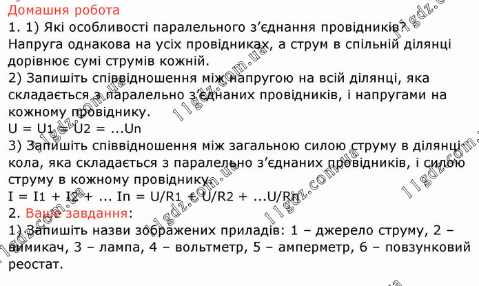 Домашня робота 1. 1) Які особливості паралельного з’єднання провідників? Напруга однакова на усіх провідниках, а струм в спільній ділянці дорівнює сумі струмів кожній. 2) Запишіть співвідношення між напругою на всій ділянці, яка складається з паралельно з’єднаних провідників, і напругами на кожному провіднику. U = U1 = U2 = ...Un 3) Запишіть співвідношення між загальною силою струму в ділянці кола, яка складається з паралельно з’єднаних провідників, і силою струму в кожному провіднику. I = I1 + I2 + ... In = U/R1 + U/R2 + ...U/Rn 2. Ваше завдання: 1) Запишіть назви зображених приладів: 1 – джерело струму, 2 – вимикач, 3 – лампа, 4 – вольтметр, 5 – амперметр, 6 – повзунковий реостат.