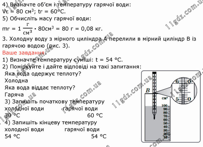 4) Визначте об’єм і температуру гарячої води: Vг = 80 см3; tг = 60°С. 5) Обчисліть масу гарячої води: mг = 1 г/〖см〗^3 ∙ 80см3 = 80 г = 0,08 кг. 3. Холодну воду з мірного циліндра A перелили в мірний циліндр B із гарячою водою (рис. 3). Ваше завдання: 1) Визначте температуру суміші: t = 54 °С. 2) Поміркуйте і дайте відповіді на такі запитання: Яка вода одержує теплоту? Холодна Яка вода віддає теплоту? Гаряча 3) Запишіть початкову температуру холодної води гарячої води 30 °С 60 °С 4) Запишіть кінцеву температуру холодної води гарячої води 54 °С 54 °С