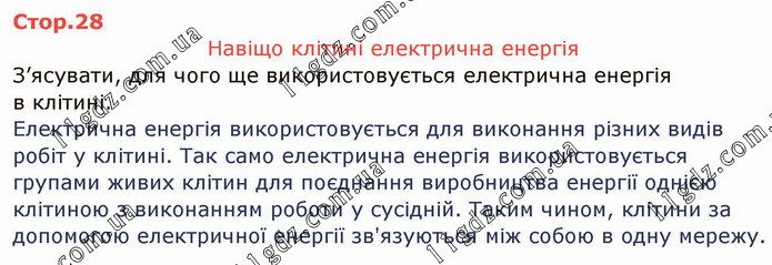 Навіщо клітині електрична енергія З’ясувати, для чого ще використовується електрична енергія в клітині. Електрична енергія використовується для виконання різних видів робіт у клітині. Так само електрична енергія використовується групами живих клітин для поєднання виробництва енергії однією клітиною з виконанням роботи у сусідній. Таким чином, клітини за допомогою електричної енергії зв'язуються між собою в одну мережу.