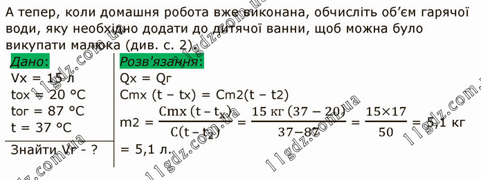А тепер, коли домашня робота вже виконана, обчисліть об’єм гарячої води, яку необхідно додати до дитячої ванни, щоб можна було викупати малюка (див. с. 2). Дано: Vx = 15 л tox = 20 °C toг = 87 °С t = 37 °C Розв'язання: Qх = Qг Сmx (t – tx) = Сm2(t – t2) m2 = (Сmx (t – t_x ))/С(t – t_2 ) = (15 кг (37 - 20))/(37-87) = (15×17)/50 = 5,1 кг = 5,1 л.