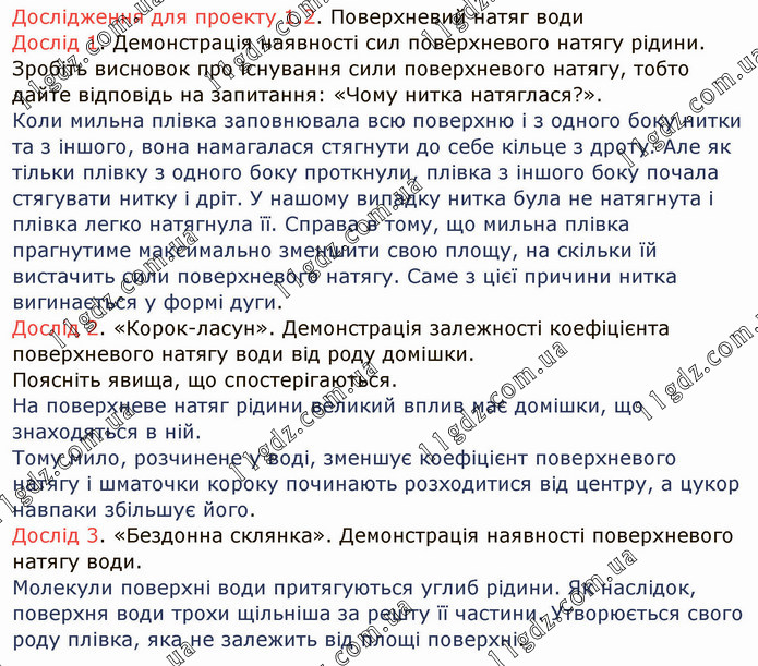 Дослідження для проекту 1.2. Поверхневий натяг води Дослід 1. Демонстрація наявності сил поверхневого натягу рідини. Зробіть висновок про існування сили поверхневого натягу, тобто дайте відповідь на запитання: «Чому нитка натяглася?». Коли мильна плівка заповнювала всю поверхню і з одного боку нитки та з іншого, вона намагалася стягнути до себе кільце з дроту. Але як тільки плівку з одного боку проткнули, плівка з іншого боку почала стягувати нитку і дріт. У нашому випадку нитка була не натягнута і плівка легко натягнула її. Справа в тому, що мильна плівка прагнутиме максимально зменшити свою площу, на скільки їй вистачить сили поверхневого натягу. Саме з цієї причини нитка вигинається у формі дуги. Дослід 2. «Корок-ласун». Демонстрація залежності коефіцієнта поверхневого натягу води від роду домішки. Поясніть явища, що спостерігаються. На поверхневе натяг рідини великий вплив має домішки, що знаходяться в ній. Тому мило, розчинене у воді, зменшує коефіцієнт поверхневого натягу і шматочки короку починають розходитися від центру, а цукор навпаки збільшує його. Дослід 3. «Бездонна склянка». Демонстрація наявності поверхневого натягу води. Молекули поверхні води притягуються углиб рідини. Як наслідок, поверхня води трохи щільніша за решту її частини. Утворюється свого роду плівка, яка не залежить від площі поверхні.
