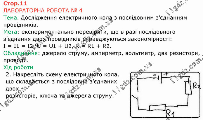 ЛАБОРАТОРНА РОБОТА № 4 Тема. Дослідження електричного кола з послідовним з’єднанням провідників. Мета: експериментально перевірити, що в разі послідовного з’єднання двох провідників справджуються закономірності: І = І1 = І2, U = U1 + U2, R = R1 + R2. Обладнання: джерело струму, амперметр, вольтметр, два резистори, проводи. Хід роботи 2. Накресліть схему електричного кола, що складається з послідовно з’єднаних двох резисторів, ключа та джерела струму.