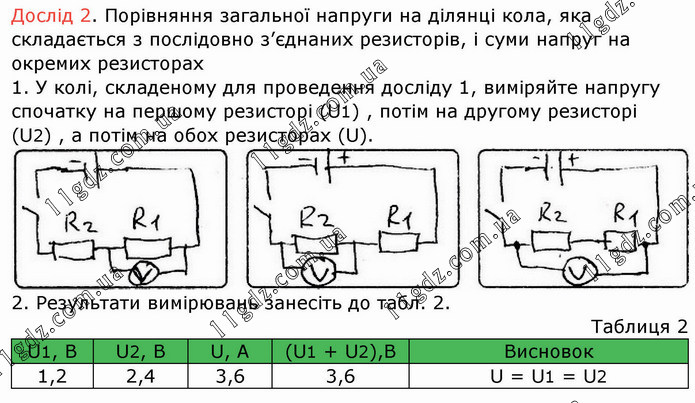 Дослід 2. Порівняння загальної напруги на ділянці кола, яка складається з послідовно з’єднаних резисторів, і суми напруг на окремих резисторах 1. У колі, складеному для проведення досліду 1, виміряйте напругу спочатку на першому резисторі (U1) , потім на другому резисторі (U2) , а потім на обох резисторах (U).