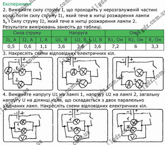 Експеримент 2. Виміряйте силу струму І, що проходить у нерозгалуженій частині кола, потім силу струму І1, який тече в нитці розжарення лампи 1, і силу струму I2, який тече в нитці розжарення лампи 2. Результати вимірювань занесіть до таблиці. 4. Виміряйте напругу U1 на лампі 1, напругу U2 на лампі 2, загальну напругу U на ділянці кола, що складається з двох паралельно з’єднаних ламп. Накресліть схеми відповідних електричних кіл.