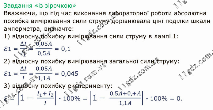 Завдання «із зірочкою» Вважаючи, що під час виконання лабораторної роботи абсолютна похибка вимірювання сили струму дорівнювала ціні поділки шкали амперметра, визначте: 1) відносну похибку вимірювання сили струму в лампі 1: ε1 = ∆I/I_1 = 0,05A/0,5A = 0,1 2) відносну похибку вимірювання загальної сили струму: ε1 = ∆I/I = 0,05A/1,1A = 0,045 3) відносну похибку експерименту: ε = |1- (I_1+ I_2)/I| ∙ 100% = |1- (0,5A+0,+A)/1,1A| ∙ 100% = 0.