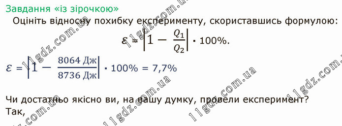 Завдання «із зірочкою» Оцініть відносну похибку експерименту, скориставшись формулою: ε = |1- Q_1/Q_2 | ∙ 100%. ε = |1- (8064 Дж)/(8736 Дж)| ∙ 100% = 7,7% Чи достатньо якісно ви, на вашу думку, провели експеримент? Так,