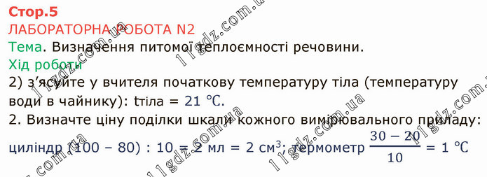 ЛАБОРАТОРНА РОБОТА N2 Тема. Визначення питомої теплоємності речовини. Хід роботи 2) з’ясуйте у вчителя початкову температуру тіла (температуру води в чайнику): tтіла = 21 ℃. 2. Визначте ціну поділки шкали кожного вимірювального приладу: циліндр (100 – 80) : 10 = 2 мл = 2 см3; термометр (30 - 20)/10 = 1 ℃