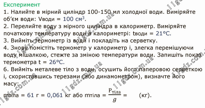 Експеримент 1. Налийте в мірний циліндр 100-150 мл холодної води. Виміряйте об’єм води: Vводи = 100 см3. 2. Перелийте воду з мірного циліндра в калориметр. Виміряйте початкову температуру води в калориметрі: tводи = 21°С. 3. Вийміть термометр із води і покладіть на серветку. 4. Знову помістіть термометр у калориметр і, злегка перемішуючи воду мішалкою, стежте за зміною температури води. Запишіть показ термометра t = 26°С. 6. Вийміть металеве тіло з води, осушить його паперовою серветкою і, скориставшись терезами (або динамометром), визначте його масу: mтіла = 61 г = 0,061 кг або mтіла = Р_тіла/g = (кг).