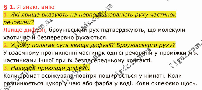 Які явища вказують на невпорядкованість руху частинок речовини? Явище дифузії, броунівський рух підтверджують, що молекули хаотично й безперервно рухаються. 2. У чому полягає суть явища дифузії? Броунівського руху? У взаємному проникненні частинок однієї речовини у проміжки між частинками іншої при їх безпосередньому контакті. 3. Наведіть приклади дифузії. Коли аромат освіжувала повітря поширюється у кімнаті. Коли розчинюється цукор у чаю або фарба у воді. Коли склеюємо щось.
