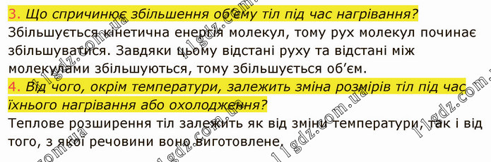 Що спричинює збільшення об’єму тіл під час нагрівання? Збільшується кінетична енергія молекул, тому рух молекул починає збільшуватися. Завдяки цьому відстані руху та відстані між молекулами збільшуються, тому збільшується об’єм. 4. Від чого, окрім температури, залежить зміна розмірів тіл під час їхнього нагрівання або охолодження? Теплове розширення тіл залежить як від зміни температури, так і від того, з якої речовини воно виготовлене.
