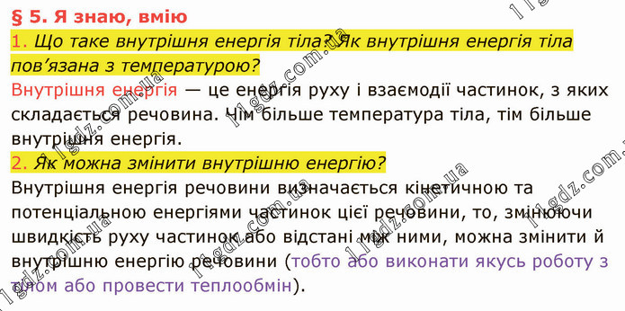 Що таке внутрішня енергія тіла? Як внутрішня енергія тіла пов’язана з температурою? Внутрішня енергія — це енергія руху і взаємодії частинок, з яких складається речовина. Чім більше температура тіла, тім більше внутрішня енергія. 2. Як можна змінити внутрішню енергію? Внутрішня енергія речовини визначається кінетичною та потенціальною енергіями частинок цієї речовини, то, змінюючи швидкість руху частинок або відстані між ними, можна змінити й внутрішню енергію речовини (тобто або виконати якусь роботу з тілом або провести теплообмін).