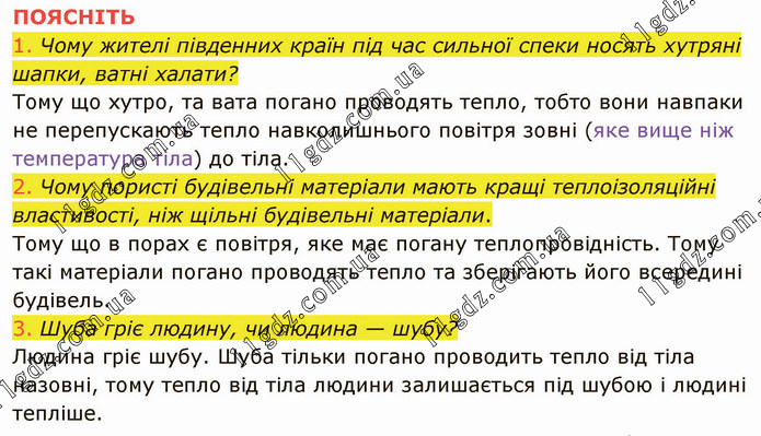 Чому жителі південних країн під час сильної спеки носять хутряні шапки, ватні халати? Тому що хутро, та вата погано проводять тепло, тобто вони навпаки не перепускають тепло навколишнього повітря зовні (яке вище ніж температура тіла) до тіла. 2. Чому пористі будівельні матеріали мають кращі теплоізоляційні властивості, ніж щільні будівельні матеріали. Тому що в порах є повітря, яке має погану теплопровідність. Тому такі матеріали погано проводять тепло та зберігають його всередині будівель. 3. Шуба гріє людину, чи людина — шубу? Людина гріє шубу. Шуба тільки погано проводить тепло від тіла назовні, тому тепло від тіла людини залишається під шубою і людині тепліше.