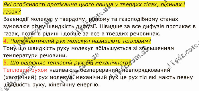 Які особливості протікання цього явища у твердих тілах, рідинах і газах? Взаємодії молекул у твердому, рідкому та газоподібному станах зумовлює різну швидкість дифузії. Швидше за все дифузія протикає в газах, потім в рідині і довше за все в твердих речовинах. 4. Чому хаотичний рух молекул називають тепловим? Тому що швидкість руху молекул збільшується зі збільшенням температури речовини. 5. Що відрізняє тепловий рух від механічного? Тепловим рухом називають безперервний, невпорядкований (хаотичний) рух молекул, механічний рух це рух тіл які мають певну швидкість руху, кінетичну енергію.