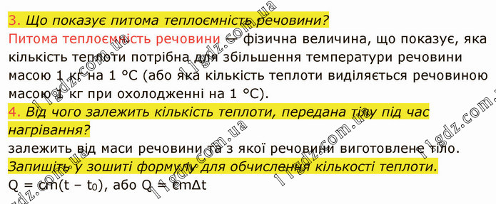 Що показує питома теплоємність речовини? Питома теплоємність речовини — фізична величина, що показує, яка кількість теплоти потрібна для збільшення температури речовини масою 1 кг на 1 °С (або яка кількість теплоти виділяється речовиною масою 1 кг при охолодженні на 1 °С). 4. Від чого залежить кількість теплоти, передана тілу під час нагрівання? залежить від маси речовини та з якої речовини виготовлене тіло. Запишіть у зошиті формулу для обчислення кількості теплоти. Q = cm(t – t0), або Q = cm∆t