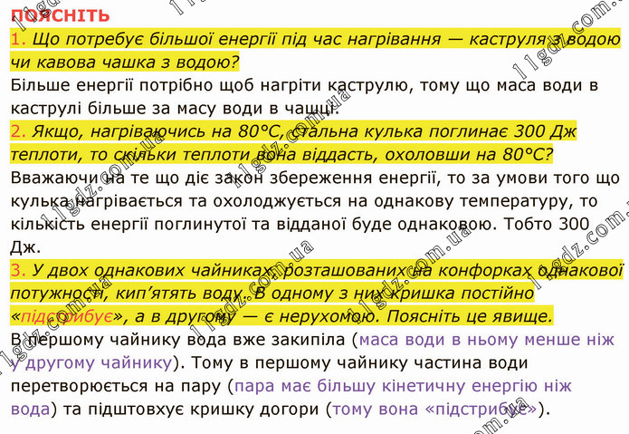 Що потребує більшої енергії під час нагрівання — каструля з водою чи кавова чашка з водою? Більше енергії потрібно щоб нагріти каструлю, тому що маса води в каструлі більше за масу води в чашці. 2. Якщо, нагріваючись на 80°С, стальна кулька поглинає 300 Дж теплоти, то скільки теплоти вона віддасть, охоловши на 80°С? Вважаючи на те що діє закон збереження енергії, то за умови того що кулька нагрівається та охолоджується на однакову температуру, то кількість енергії поглинутої та відданої буде однаковою. Тобто 300 Дж. 3. У двох однакових чайниках, розташованих на конфорках однакової потужності, кип’ятять воду. В одному з них кришка постійно «підстрибує», а в другому — є нерухомою. Поясніть це явище. В першому чайнику вода вже закипіла (маса води в ньому менше ніж у другому чайнику). Тому в першому чайнику частина води перетворюється на пару (пара має більшу кінетичну енергію ніж вода) та підштовхує кришку догори (тому вона «підстрибує»).