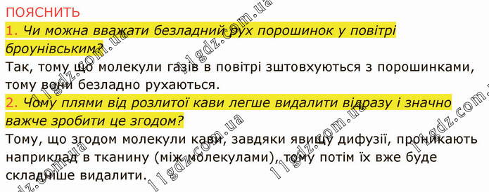 1. Чи можна вважати безладний рух порошинок у повітрі броунівським? Так, тому що молекули газів в повітрі зштовхуються з порошинками, тому вони безладно рухаються. 2. Чому плями від розлитої кави легше видалити відразу і значно важче зробити це згодом? Тому, що згодом молекули кави, завдяки явищу дифузії, проникають наприклад в тканину (між молекулами), тому потім їх вже буде складніше видалити.