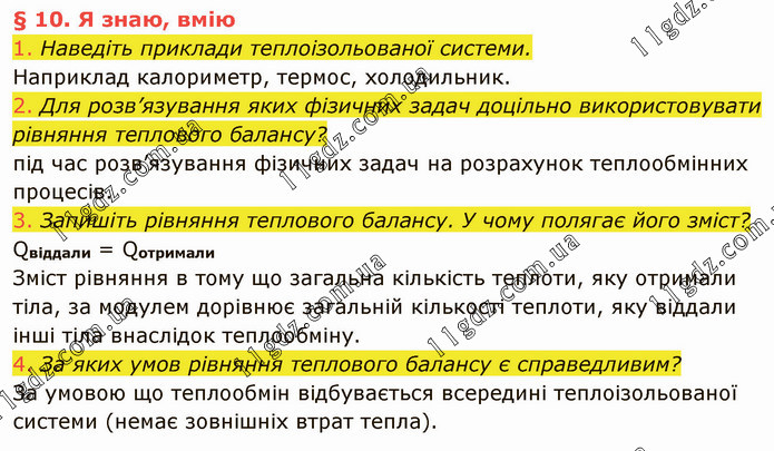 Наведіть приклади теплоізольованої системи. Наприклад калориметр, термос, холодильник. 2. Для розв’язування яких фізичних задач доцільно використовувати рівняння теплового балансу? під час розв’язування фізичних задач на розрахунок теплообмінних процесів. 3. Запишіть рівняння теплового балансу. У чому полягає його зміст? Qвіддали = Qотримали Зміст рівняння в тому що загальна кількість теплоти, яку отримали тіла, за модулем дорівнює загальній кількості теплоти, яку віддали інші тіла внаслідок теплообміну. 4. За яких умов рівняння теплового балансу є справедливим? За умовою що теплообмін відбувається всередині теплоізольованої системи (немає зовнішніх втрат тепла).