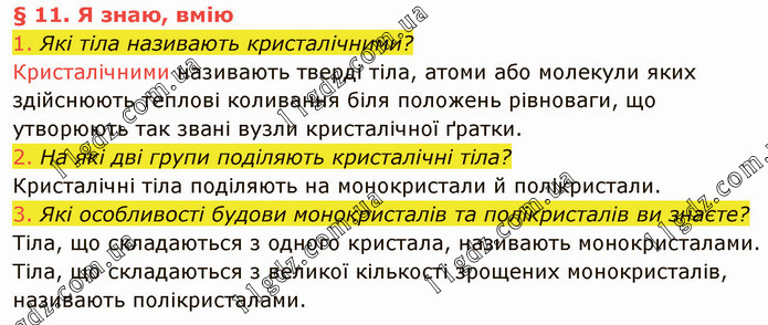Які тіла називають кристалічними? Кристалічними називають тверді тіла, атоми або молекули яких здійснюють теплові коливання біля положень рівноваги, що утворюють так звані вузли кристалічної ґратки. 2. На які дві групи поділяють кристалічні тіла? Кристалічні тіла поділяють на монокристали й полікристали. 3. Які особливості будови монокристалів та полікристалів ви знаєте? Тіла, що складаються з одного кристала, називають монокристалами. Тіла, що складаються з великої кількості зрощених монокристалів, називають полікристалами.
