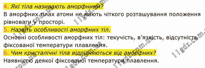 Які тіла називають аморфними? В аморфних тілах атоми не мають чіткого розташування положення рівноваги у просторі. 5. Назвіть особливості аморфних тіл. Основні особливості аморфних тіл: текучість, в’язкість, відсутність фіксованої температури плавлення. 6. Чим кристалічні тіла відрізняються від аморфних? Наявністю деякої фіксованої температури плавлення.