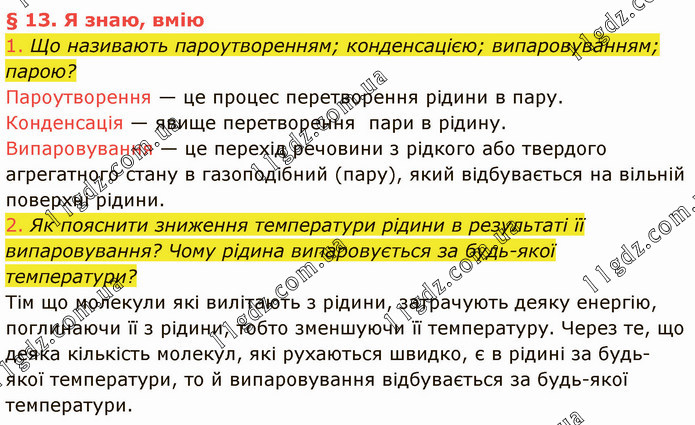 Що називають пароутворенням; конденсацією; випаровуванням; парою? Пароутворення — це процес перетворення рідини в пару. Конденсація — явище перетворення пари в рідину. Випаровування — це перехід речовини з рідкого або твердого агрегатного стану в газоподібний (пару), який відбувається на вільній поверхні рідини. 2. Як пояснити зниження температури рідини в результаті її випаровування? Чому рідина випаровується за будь-якої температури? Тім що молекули які вилітають з рідини, затрачують деяку енергію, поглинаючи її з рідини, тобто зменшуючи її температуру. Через те, що деяка кількість молекул, які рухаються швидко, є в рідині за будь-якої температури, то й випаровування відбувається за будь-якої температури.