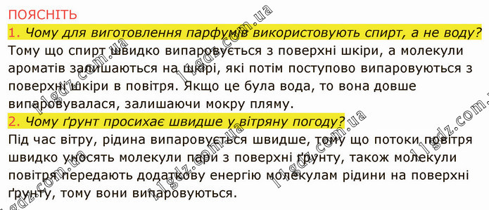 Чому для виготовлення парфумів використовують спирт, а не воду? Тому що спирт швидко випаровується з поверхні шкіри, а молекули ароматів залишаються на шкірі, які потім поступово випаровуються з поверхні шкіри в повітря. Якщо це була вода, то вона довше випаровувалася, залишаючи мокру пляму. 2. Чому ґрунт просихає швидше у вітряну погоду? Під час вітру, рідина випаровується швидше, тому що потоки повітря швидко уносять молекули пари з поверхні ґрунту, також молекули повітря передають додаткову енергію молекулам рідини на поверхні ґрунту, тому вони випаровуються.