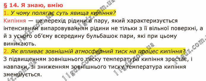 У чому полягає суть явища кипіння? Кипіння — це перехід рідини в пару, який характеризується інтенсивним випаровуванням рідини не тільки з її вільної поверхні, а й з усього об’єму всередину бульбашок пари, які при цьому виникають. 2. Як впливає зовнішній атмосферний тиск на процес кипіння? З підвищенням зовнішнього тиску температура кипіння зростає, і навпаки, зі зниженням зовнішнього тиску температура кипіння зменшується.