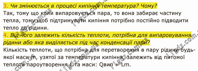 Чи змінюється в процесі кипіння температура? Чому? Так, тому що коли випаровується пара, то вона забирає частину тепла, тому щоб підтримувати кипіння потрібно постійно підводити тепло до рідини. 4. Від чого залежить кількість теплоти, потрібна для випаровування рідини або яка виділяється під час конденсації пари? Кількість теплоти, що потрібна для перетворення в пару рідини будь-якої маси m, узятої за температури кипіння, залежить від питомої теплоти пароутворення L та маси: Qвип = Lm.