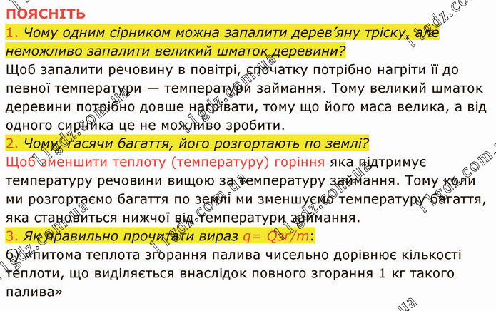 ПОЯСНІТЬ 1. Чому одним сірником можна запалити дерев’яну тріску, але неможливо запалити великий шматок деревини? Щоб запалити речовину в повітрі, спочатку потрібно нагріти її до певної температури — температури займання. Тому великий шматок деревини потрібно довше нагрівати, тому що його маса велика, а від одного сирника це не можливо зробити. 2. Чому, гасячи багаття, його розгортають по землі? Щоб зменшити теплоту (температуру) горіння яка підтримує температуру речовини вищою за температуру займання. Тому коли ми розгортаємо багаття по землі ми зменшуємо температуру багаття, яка становиться нижчої від температури займання. 3. Як правильно прочитати вираз q= Qзг/m: б) «питома теплота згорання палива чисельно дорівнює кількості теплоти, що виділяється внаслідок повного згорання 1 кг такого палива»