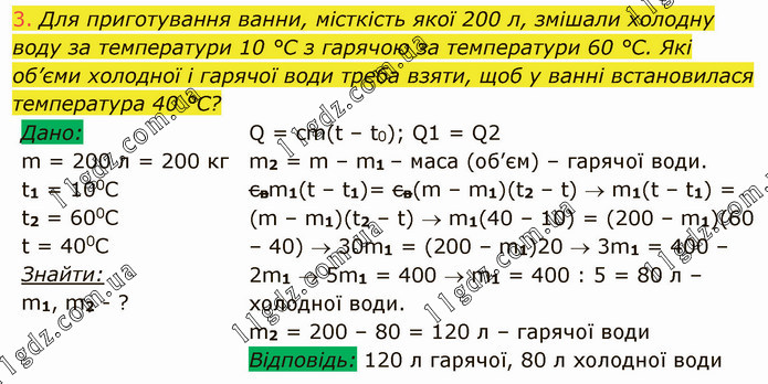 Для приготування ванни, місткість якої 200 л, змішали холодну воду за температури 10 °C з гарячою за температури 60 °C. Які об’єми холодної і гарячої води треба взяти, щоб у ванні встановилася температура 40 °C? Q = cm(t – t0); Q1 = Q2 m2 = m – m1 – маса (об’єм) – гарячої води. cвm1(t – t1)= cв(m – m1)(t2 – t) m1(t – t1) = (m – m1)(t2 – t) m1(40 – 10) = (200 – m1)(60 – 40) 30m1 = (200 – m1)20 3m1 = 400 – 2m1 5m1 = 400 m1 = 400 : 5 = 80 л – холодної води. m2 = 200 – 80 = 120 л – гарячої води Відповідь: 120 л гарячої, 80 л холодної води