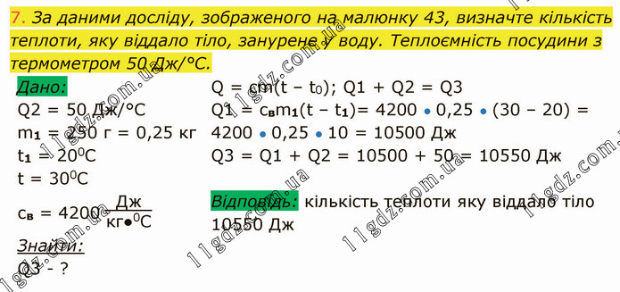 За даними досліду, зображеного на малюнку 43, визначте кількість теплоти, яку віддало тіло, занурене у воду. Теплоємність посудини з термометром 50 Дж/°С. Q = cm(t – t0); Q1 + Q2 = Q3 Q1 = cвm1(t – t1)= 4200 ● 0,25 ● (30 – 20) = 4200 ● 0,25 ● 10 = 10500 Дж Q3 = Q1 + Q2 = 10500 + 50 = 10550 Дж Відповідь: кількість теплоти яку віддало тіло 10550 Дж