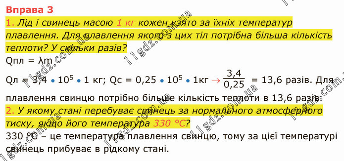 Лід і свинець масою 1 кг кожен узято за їхніх температур плавлення. Для плавлення якого з цих тіл потрібна більша кількість теплоти? У скільки разів? Qпл = λm Qл = 3,4 ● 105 ● 1 кг; Qс = 0,25 ● 105 ● 1кг 3,40,25 = 13,6 разів. Для плавлення свинцю потрібно більше кількість теплоти в 13,6 разів. 2. У якому стані перебуває свинець за нормального атмосферного тиску, якщо його температура 330 °С? 330 °С – це температура плавлення свинцю, тому за цієї температурі свинець прибуває в рідкому стані.