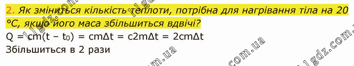 Як зміниться кількість теплоти, потрібна для нагрівання тіла на 20 °С, якщо його маса збільшиться вдвічі? Q = cm(t – t0) = cm∆t = c2m∆t = 2cm∆t Збільшиться в 2 рази