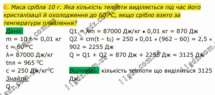 Маса срібла 10 г. Яка кількість теплоти виділяється під час його кристалізації й охолодження до 60 °С, якщо срібло взято за температури плавлення? Q1 = λm = 87000 Дж/кг ● 0,01 кг = 870 Дж Q2 = cm(t – t0) = 250 ● 0,01 ● (962 – 60) = 2,5 ● 902 = 2255 Дж Q = Q1 + Q2 = 870 Дж + 2255 Дж = 3125 Дж Відповідь: кількість теплоти що виділиться 3125 Дж.