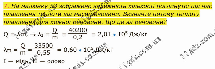 На малюнку 53 зображено залежність кількості поглинутої під час плавлення теплоти від маси речовини. Визначте питому теплоту плавлення для кожної речовини. Що це за речовини? Q = λm, λІ = Qm = 402000,2 = 2,01 ● 105 Дж/кг λІІ = Qm = 335000,55 = 0,60 ● 105 Дж/кг І — мідь, ІІ — олово