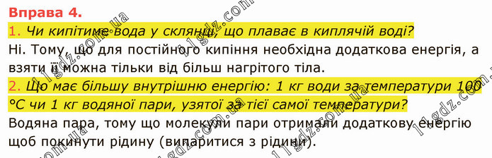 Чи кипітиме вода у склянці, що плаває в киплячій воді? Ні. Тому, що для постійного кипіння необхідна додаткова енергія, а взяти її можна тільки від більш нагрітого тіла. 2. Що має більшу внутрішню енергію: 1 кг води за температури 100 °C чи 1 кг водяної пари, узятої за тієї самої температури? Водяна пара, тому що молекули пари отримали додаткову енергію щоб покинути рідину (випаритися з рідини).