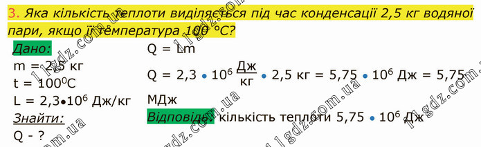 Яка кількість теплоти виділяється під час конденсації 2,5 кг водяної пари, якщо її температура 100 °С? Q = Lm Q = 2,3 ● 106 Джкг ● 2,5 кг = 5,75 ● 106 Дж = 5,75 МДж Відповідь: кількість теплоти 5,75 ● 106 Дж