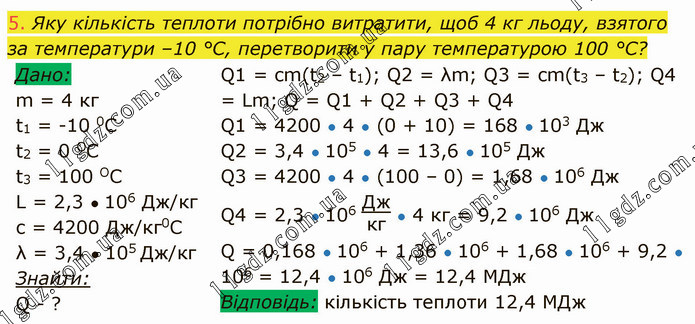 Яку кількість теплоти потрібно витратити, щоб 4 кг льоду, взятого за температури –10 °C, перетворити у пару температурою 100 °C? Q1 = cm(t2 – t1); Q2 = λm; Q3 = cm(t3 – t2); Q4 = Lm; Q = Q1 + Q2 + Q3 + Q4 Q1 = 4200 ● 4 ● (0 + 10) = 168 ● 103 Дж Q2 = 3,4 ● 105 ● 4 = 13,6 ● 105 Дж Q3 = 4200 ● 4 ● (100 – 0) = 1,68 ● 106 Дж Q4 = 2,3 ● 106 Джкг ● 4 кг = 9,2 ● 106 Дж Q = 0,168 ● 106 + 1,36 ● 106 + 1,68 ● 106 + 9,2 ● 106 = 12,4 ● 106 Дж = 12,4 МДж Відповідь: кількість теплоти 12,4 МДж