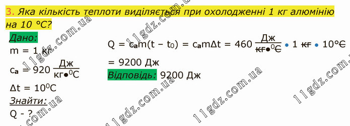 Яка кількість теплоти виділяється при охолодженні 1 кг алюмінію на 10 °С? Q = cam(t – t0) = cam∆t = 460 Джкг●0С ● 1 кг ● 10°С = 9200 Дж Відповідь: 9200 Дж