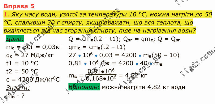 Яку масу води, узятої за температури 10 °С, можна нагріти до 50 °С, спаливши 30 г спирту, якщо вважати, що вся теплота, що виділяється під час згорання спирту, піде на нагрівання води? Q = cmв(t2 – t1); Qзг = qmс; Q = Qзг qmс = cmв(t2 – t1) 27 ● 106 ● 0,03 = 4200 ● mв(50 – 10) 0,81 ● 106 Дж = 4200 ● 40 ● mв mв = 0,81●1060,168●106 = 4,82 кг Відповідь: можна нагріти 4,82 кг води