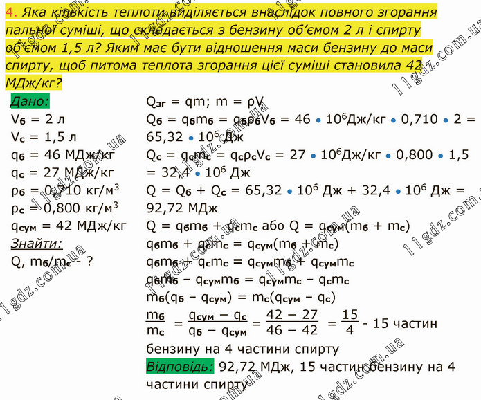 Яка кількість теплоти виділяється внаслідок повного згорання пальної суміші, що складається з бензину об’ємом 2 л і спирту об’ємом 1,5 л? Яким має бути відношення маси бензину до маси спирту, щоб питома теплота згорання цієї суміші становила 42 МДж/кг? Qзг = qm; m = ρV Qб = qбmб = qбρбVб = 46 ● 106Дж/кг ● 0,710 ● 2 = 65,32 ● 106 Дж Qс = qсmс = qсρсVс = 27 ● 106Дж/кг ● 0,800 ● 1,5 = 32,4 ● 106 Дж Q = Qб + Qc = 65,32 ● 106 Дж + 32,4 ● 106 Дж = 92,72 МДж Q = qбmб + qсmc або Q = qсум(mб + mc) qбmб + qсmc = qсум(mб + mc) qбmб + qсmc = qсумmб + qсумmс qбmб – qсумmб = qсумmс – qсmc mб(qб – qсум) = mc(qсум – qс) mбmc = qсум − qсqб − qсум = 42 − 2746 − 42 = 154 - 15 частин бензину на 4 частини спирту Відповідь: 92,72 МДж, 15 частин бензину на 4 частини спирту