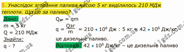 Унаслідок згорання палива масою 5 кг виділилось 210 МДж теплоти. Що це за паливо? Qзг = qm q = Qзгm = 210 ● 106 Дж : 5 кг = 42 ● 106 Дж/кг – це дизельне паливо. Відповідь: 42 ● 106 Дж/кг – це дизельне паливо