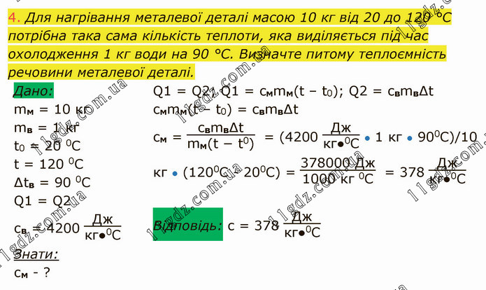 Для нагрівання металевої деталі масою 10 кг від 20 до 120 °С потрібна така сама кількість теплоти, яка виділяється під час охолодження 1 кг води на 90 °С. Визначте питому теплоємність речовини металевої деталі. Q1 = Q2; Q1 = cмmм(t – t0); Q2 = cвmв∆t cмmм(t – t0) = cвmв∆t cм = cвmв∆tmм(t − t0) = (4200 Джкг●0С ● 1 кг ● 900С)/10 кг ● (1200C - 200C) = 378000 Дж1000 кг 0C = 378 Джкг●0С Відповідь: с = 378 Джкг●0С