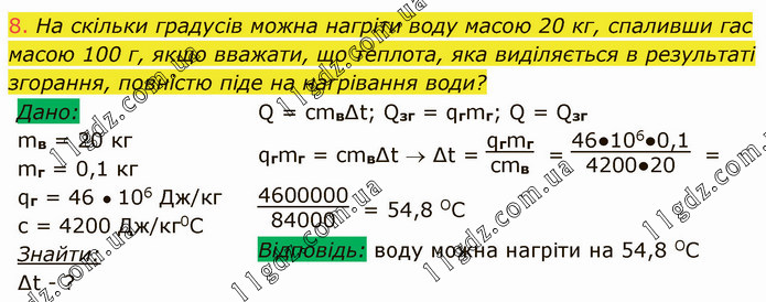 На скільки градусів можна нагріти воду масою 20 кг, спаливши гас масою 100 г, якщо вважати, що теплота, яка виділяється в результаті згорання, повністю піде на нагрівання води? Q = cmв∆t; Qзг = qгmг; Q = Qзг qгmг = cmв∆t ∆t = qгmгcmв = 46●106●0,14200●20 = 460000084000 = 54,8 OC Відповідь: воду можна нагріти на 54,8 OC