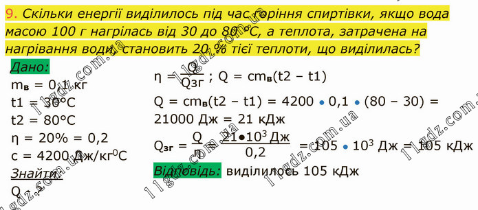 Скільки енергії виділилось під час горіння спиртівки, якщо вода масою 100 г нагрілась від 30 до 80 °С, а теплота, затрачена на нагрівання води, становить 20 % тієї теплоти, що виділилась? η = QQзг ; Q = cmв(t2 – t1) Q = cmв(t2 – t1) = 4200 ● 0,1 ● (80 – 30) = 21000 Дж = 21 кДж Qзг = Qη = 21●103 Дж0,2 = 105 ● 103 Дж = 105 кДж Відповідь: виділилось 105 кДж
