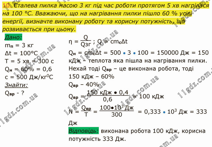 Сталева пилка масою 3 кг під час роботи протягом 5 хв нагрілася на 100 °С. Вважаючи, що на нагрівання пилки пішло 60 % усієї енергії, визначте виконану роботу та корисну потужність, що розвивається при цьому. η = QQзг ; Q = cmс∆t Qн = cmс∆t = 500 ● 3 ● 100 = 150000 Дж = 150 кДж – теплота яка пішла на нагрівання пилки. Нехай тоді Qвр – це виконана робота, тоді 150 кДж – 60% Qвр – 40% Qвр = 150 кДж ● 0,40,6 = 100 кДж N = QврТ = 100●103 Дж300 = 0,333 ● 103 Дж = 333 Дж Відповідь: виконана робота 100 кДж, корисна потужність 333 Дж.